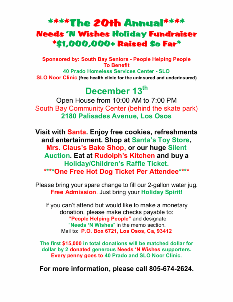 South Bay Seniors-People Helping People is a 501c3 non-profit organization supporting our neighbors in need in Los Osos and San Luis Obispo County, California directly with food giveaways, loans of medical equipment and referrals to social services providers and indirectly through two annual fundraising events.